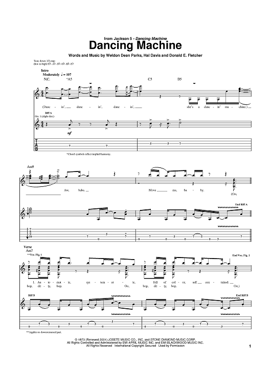 Digital Sheet Music for Dancing Machine by Hal Davis, Don Fletcher, Weldon Dean Parks, The Jackson 5 scored for Guitar Tab; id:373546
