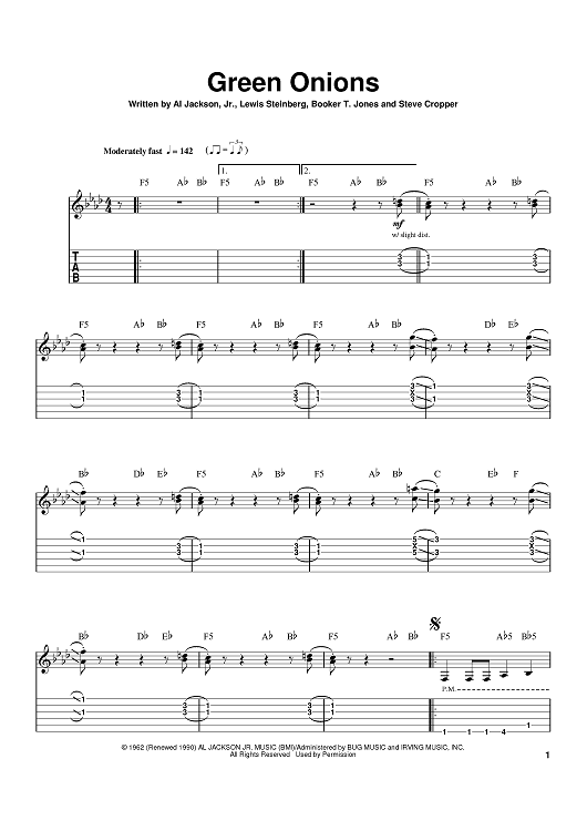 Digital Sheet Music for Green Onions by Booker T. Jones, Lewis Steinberg, Al Jackson Jr, Booker T. & The MG's scored for Guitar Tab; id:374346