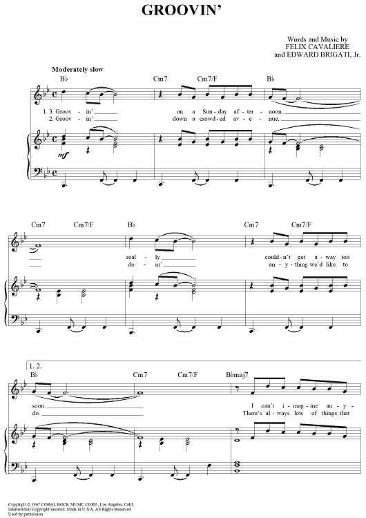 Digital Sheet Music for Groovin' by Young Rascals, Felix Cavaliere, Edward Brigati Jr. scored for Piano/Vocal/Chords; id:363925