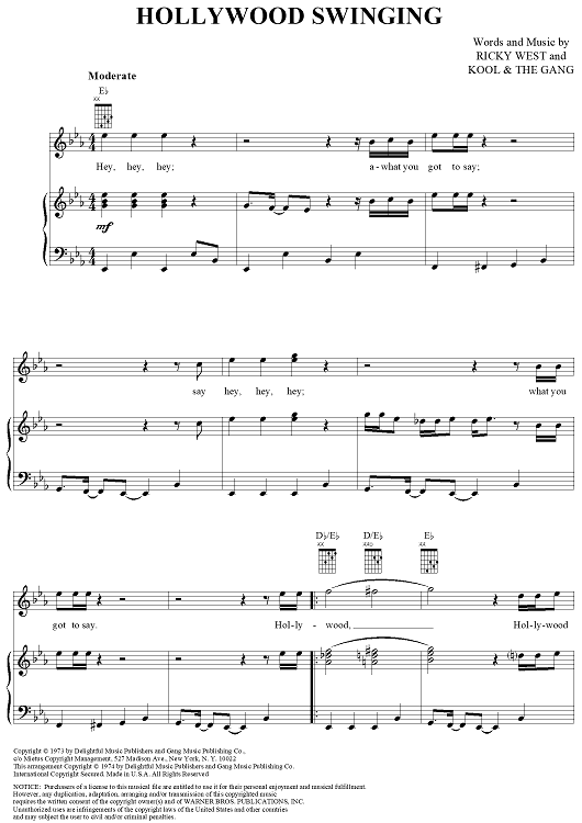 Digital Sheet Music for Hollywood Swinging by Ricky West, Kool & The Gang scored for Piano/Vocal/Chords; id:321272