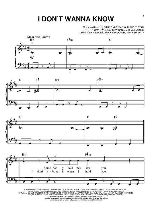 Digital Sheet Music for I Don't Wanna Know by Enya, Nicky Ryan, Roma Ryan, Diddy, Michael Jones, Loon, Erick Sermon, Parrish Smith, Mario Winans scored for Easy Piano; id:379273