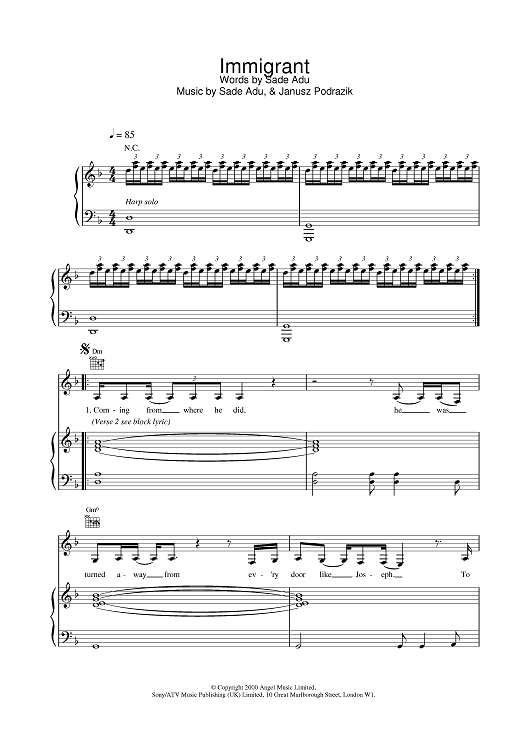 Digital Sheet Music for Immigrant by Sade Adu, J. Podrazik, Sade scored for Piano/Vocal/Chords; id:377333