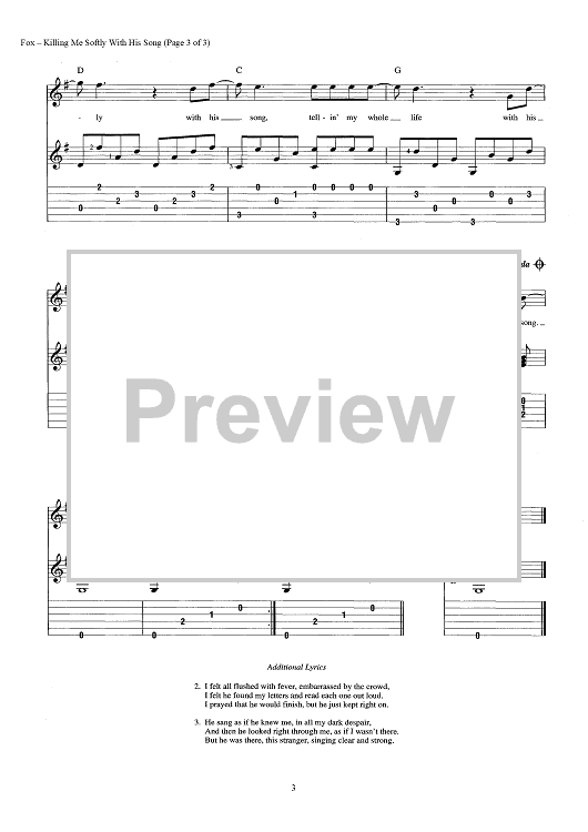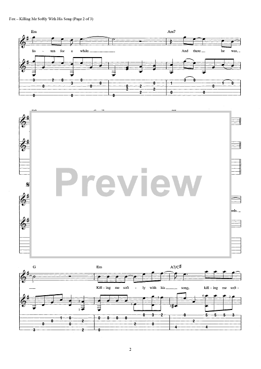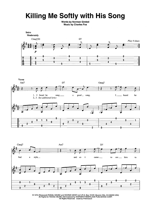 Digital Sheet Music for Killing Me Softly with His Song by Norman Gimbel, Charles Fox scored for Guitar Tab/Vocal/Chords; id:442869