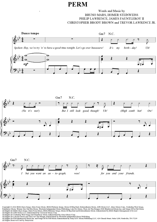 Digital Sheet Music for Perm by Trevor Lawrence, Philip Lawrence, Bruno Mars, James Fauntleroy II, Homer Steinweiss scored for Piano/Vocal/Chords; id:464611