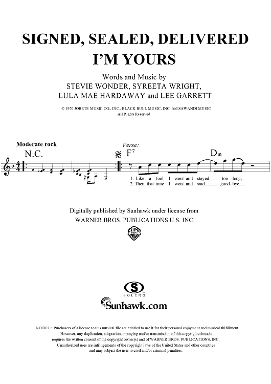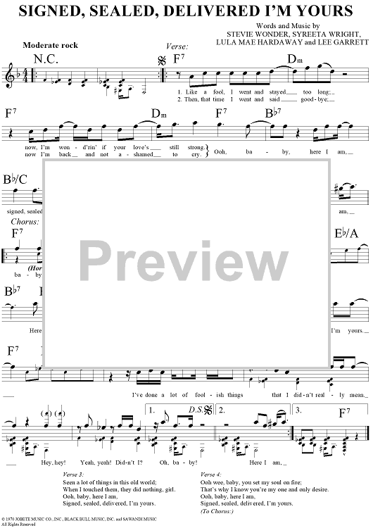 Digital Sheet Music for Signed, Sealed, Delivered (I'm Yours) by Stevie Wonder, Syreeta Wright, Lula Mae Hardaway, Lee Garrett scored for Lead Sheet; id:116527