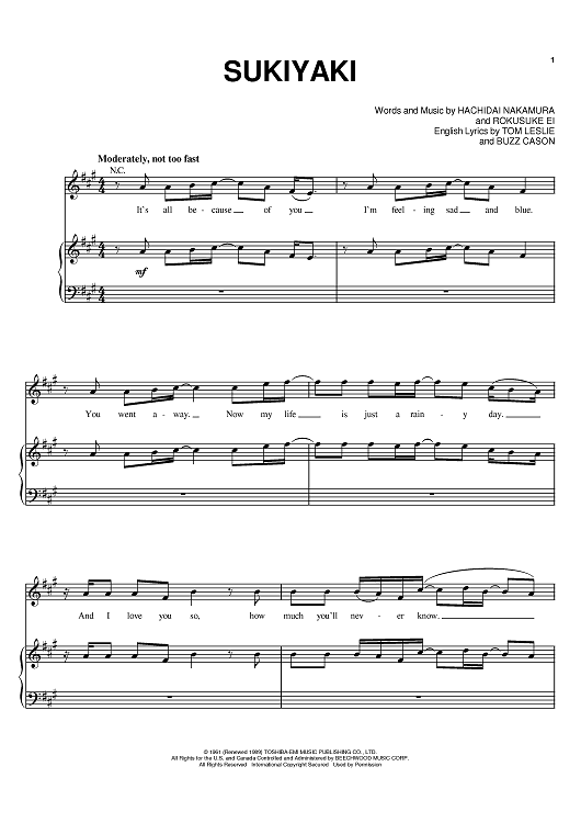 Digital Sheet Music for Sukiyaki by Hachidai Nakamura, 4 P.M., Buzz Cason, Rokusuke Ei, Kyu Sakamoto scored for Piano/Vocal/Chords; id:368130