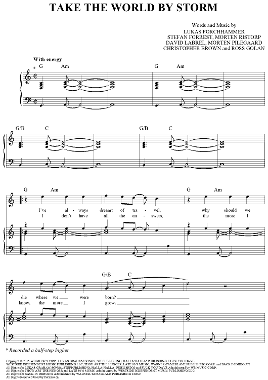 Digital Sheet Music for Take The World By Storm by Ross Golan, Lukas Forchammer, Stefan Forrest, Morten Ristorp, Morten Pilegaard, David Labrel, Lukas Graham scored for Piano/Vocal/Chords; id:464353