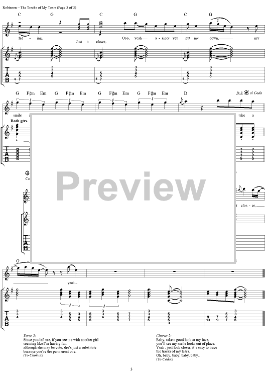 Digital Sheet Music for The Tracks Of My Tears by Smokey Robinson, Kenn Chipkin, Warren Moore, Marve Tarplin, The Miracles scored for Guitar Tab/Vocal; id:255998