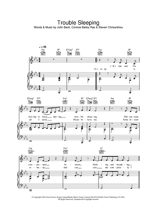 Digital Sheet Music for Trouble Sleeping by Corinne Bailey Rae, John Beck, Steven Chrisanthou scored for Piano/Vocal/Chords; id:391169