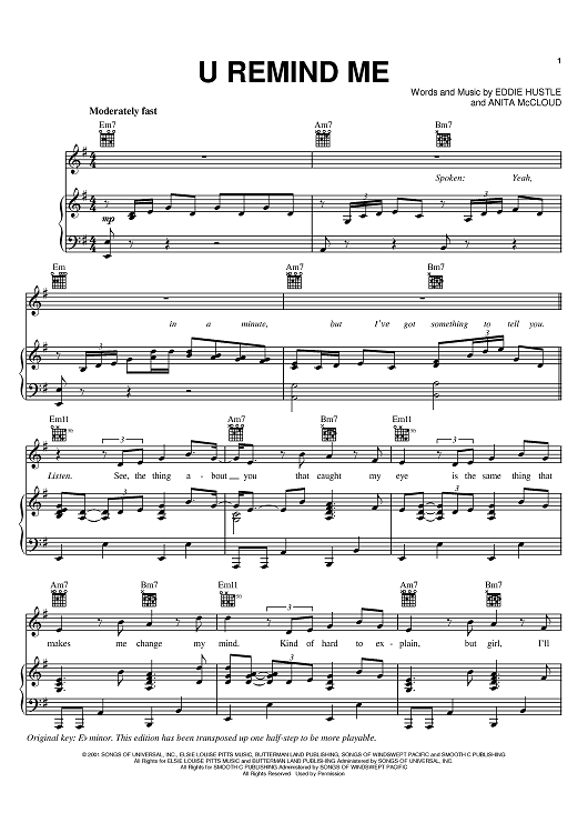 Digital Sheet Music for U Remind Me by Usher, Eddie Hustle, Anita McCloud scored for Piano/Vocal/Chords; id:374838