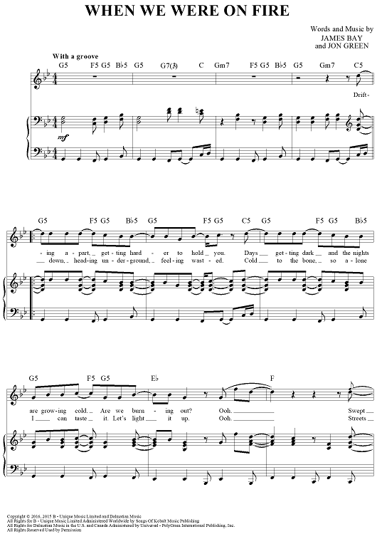 Digital Sheet Music for When We Were on Fire by Jon Green, James Bay scored for Piano/Vocal/Chords; id:460300