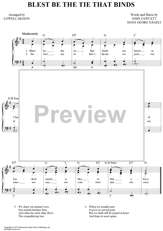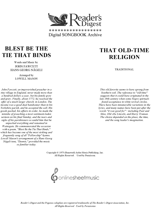 Digital Sheet Music for Blest Be The Tie That Binds / That Old-Time Religion by John Fawcett, Lowell Mason, Hans Georg Nageli, Traditional scored for Easy Piano/Vocal/Chords; id:433046