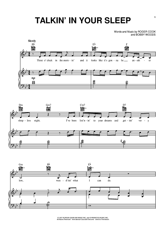 Digital Sheet Music for Talkin' In Your Sleep by Reba McEntire, Bobby Wood, Crystal Gayle, Roger Cook scored for Piano/Vocal/Chords; id:391715