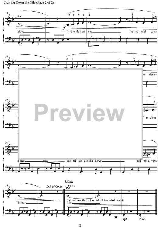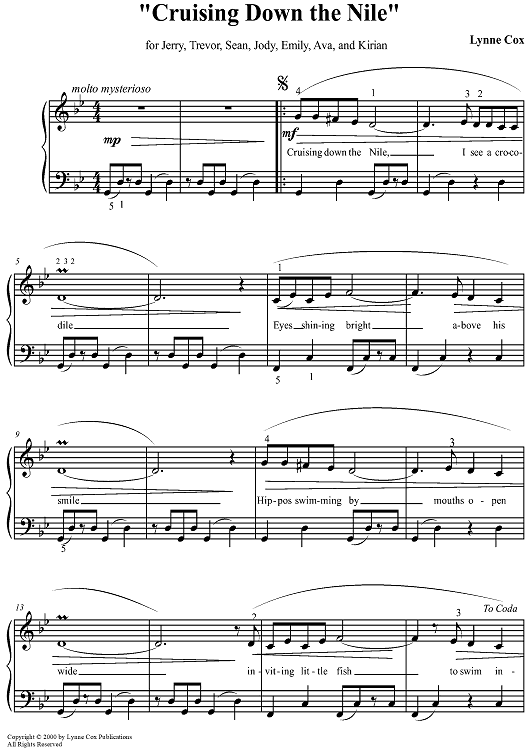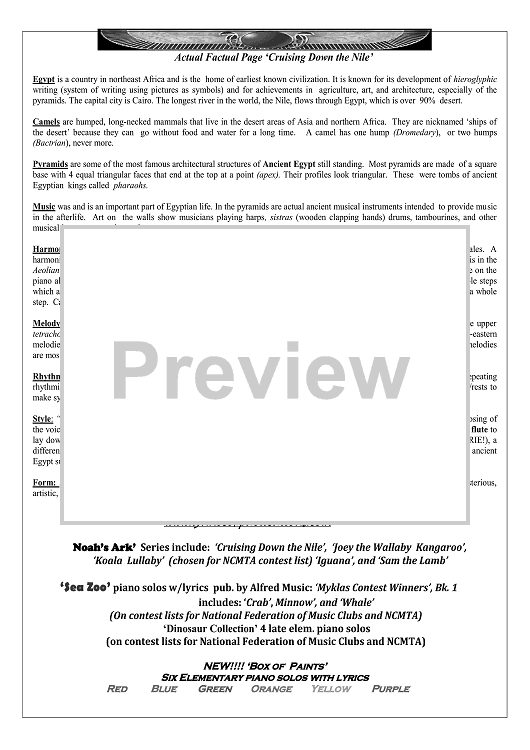 'Cruising Down the Nile' is an elementary piano solo w/lyrics in the ‘Noah’s Ark Series’. Lyrics depict Ancient Egypt and scenes along the Nile. Use of broken 5ths in LH accompaniment with syncopation depicts the plodding of camels through the desert, while melodically the RH plays along the upper tetrachord (last 4 notes) of G harmonic minor scale. Included is a mordant and turn to mimic the shake of the tambourine used in Ancient Egyptian music.