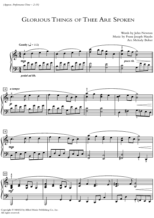 Digital Sheet Music for Glorious Things of Thee Are Spoken by Franz Joseph Haydn, John Newton, Melody Bober scored for Piano Solo; id:502019