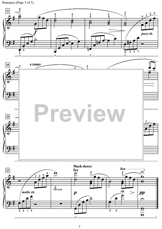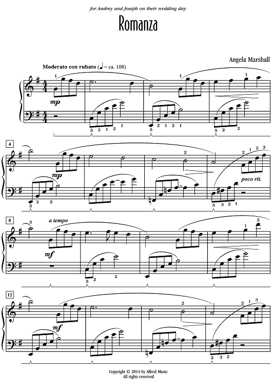 An arpeggiated accompaniment and a smooth melodic line give this intermediate piece in 4/4 meter its tender mood. Repeated patterns make it accessible, and contrasting dynamics keep it interesting. Rubato throughout provides students with the opportunity for individual interpretation. Although written in the key of G major, the piece has many accidentals throughout, which helps students develop attention to detail.