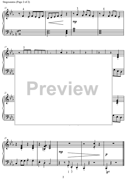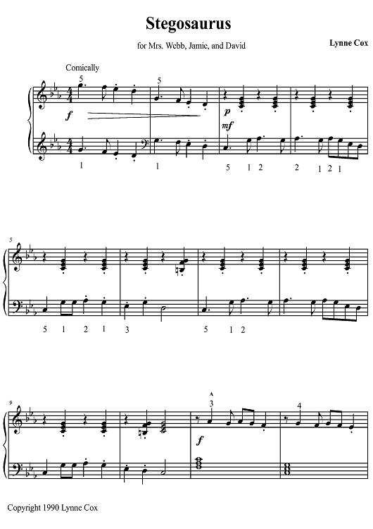 ‘Stegosaurus’: ‘Steggie’ is in a fun mood and dances to a Latin rhythm in part, with hands in unison in intro. LH takes the melody in A sections, allowing RH to have it in B section, Form: intro ABA coda, in B harmonic minor.