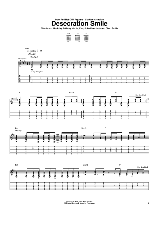 Digital Sheet Music for Desecration Smile by Flea, John Frusciante, Anthony Kiedis, Red Hot Chili Peppers, Chad Smith scored for Guitar Tab; id:391495