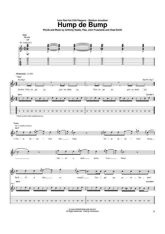 Digital Sheet Music for Hump De Bump by Flea, John Frusciante, Anthony Kiedis, Red Hot Chili Peppers, Chad Smith scored for Guitar Tab; id:391499