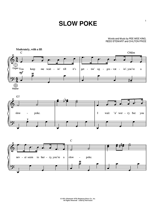 Digital Sheet Music for Slow Poke by Redd Stewart, Pee Wee King, Chilton Price scored for Easy Piano; id:381024