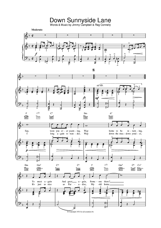 Digital Sheet Music for Down Sunnyside Lane by Reg Connelly, Jimmy Campbell scored for Piano/Vocal/Chords; id:375619