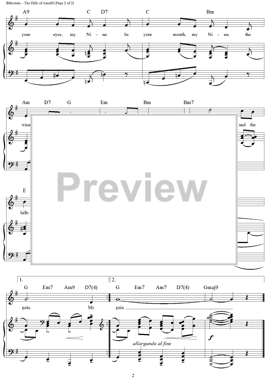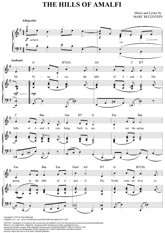 Digital Sheet Music for The Hills of Amalfi by Marc Blitzstein scored for Piano/Vocal/Chords; id:359511