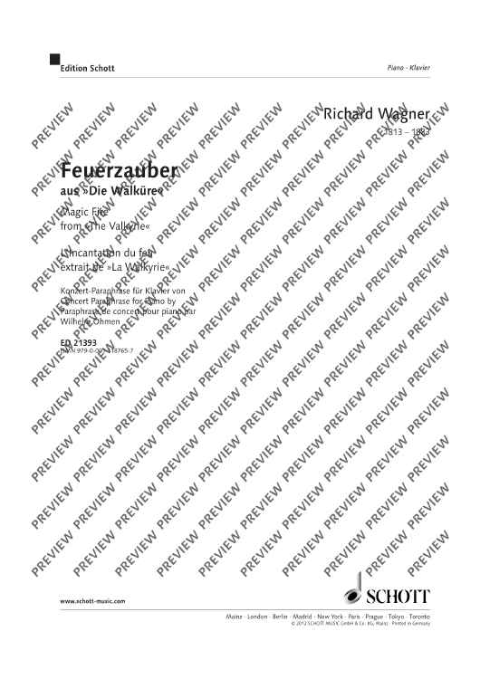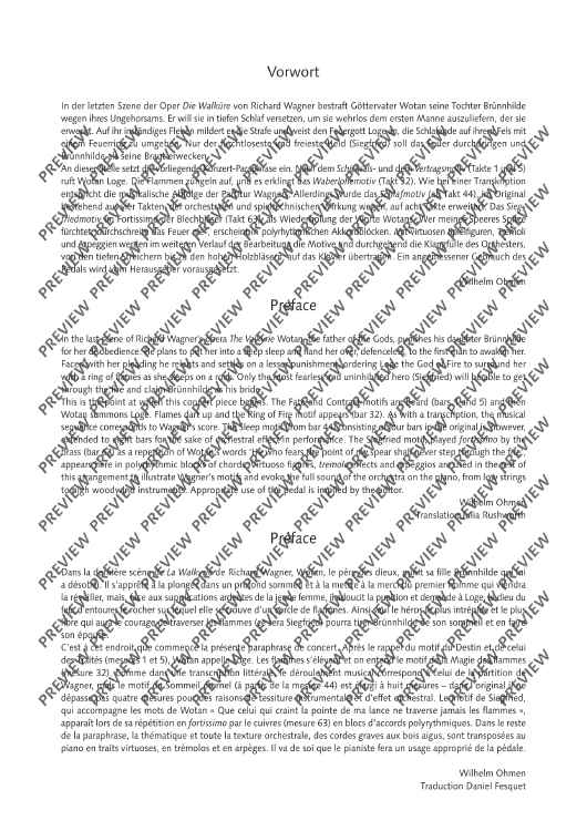 In the last scene of Wagner's opera 'The Valkyrie', Wotan, the father of the gods, punishes his daughter Brünnhilde for her disobedience. He wants to curse her to a deep sleep for her to be helplessly at the mercy of the first man who wakes her. At her pleading, he mitigates the punishment and instructs Loge, the God of Fire, to surround the sleeping woman with a ring of fire on her rock. Only the most fearless and freest hero (Siegfried) is to get through the fire and wake Brünnhilde as his bride. Here begins the concert paraphrase of Wilhelm Ohmen. As in a transcription, the musical sequence follows Wagner's score. The motifs and, throughout, the rich sonority of the orchestra, from the deep strings to the high woodwinds, are transferred to the piano with virtuoso idiomatic transfigurations, tremolos and arpeggios in the course of the arrangement. Virtuoso fireworks for the concert hall!