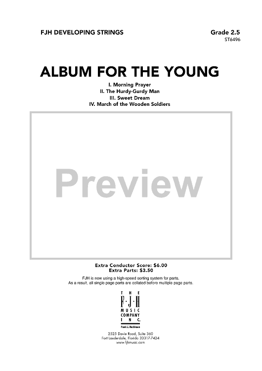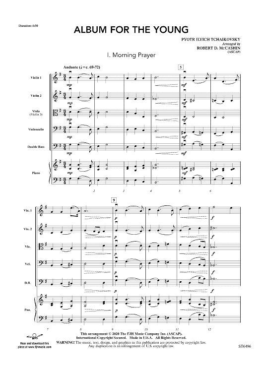 This spectacular arrangement features four movements from Tchaikovsky’s famous Album for the Young. Opening with the endearing Morning Prayer, the piece then moves into the lighthearted waltz, The Hurdy-Gurdy Man. The beautiful Sweet Dream sets the stage for the delightful last movement, March of the Wooden Soldiers. Remarkably faithful to the original while also quite accessible to younger students! (6:30)