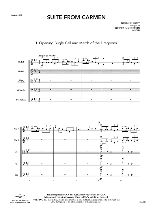This fantastic and playable suite of themes from the popular opera Carmen includes the Opening Bugle Call and March of the Dragoons, the famous Habanera, the beautiful Entr’acte to Act III – Intermezzo, and the soaring, spirited music of the Final Act. A great way to showcase your students playing some of the most famous and enjoyable opera music in the repertoire! (6:00)