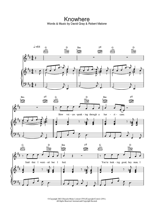 Digital Sheet Music for Knowhere by David Gray, Robert Malone scored for Piano/Vocal/Chords; id:377782