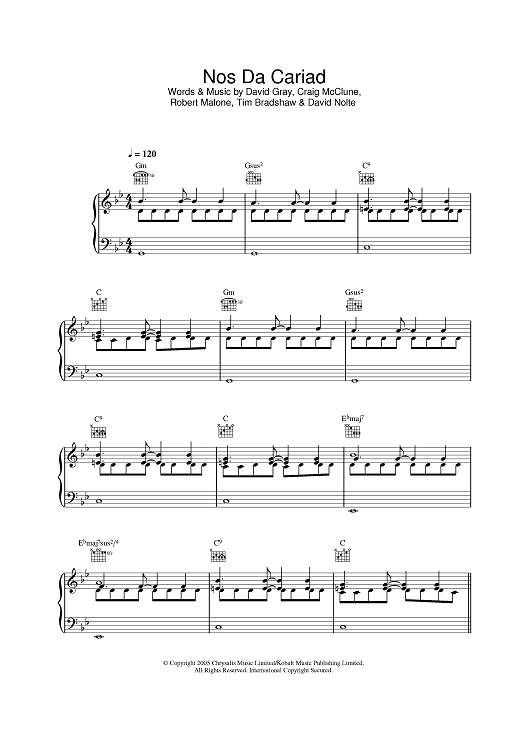 Digital Sheet Music for Nos Da Cariad by David Gray, Craig McClune, Robert Malone, Tim Bradshaw, David Nolte scored for Piano/Vocal/Chords; id:386402