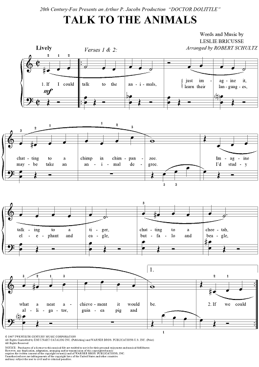 "Talk to the Animals" Sheet Music by Leslie Bricusse