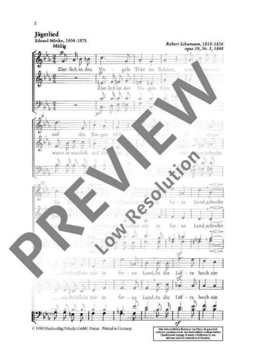 Digital Sheet Music for Hunting song / Goodnight - Choral Score by Robert Schumann scored for Mixed Choir (satb); id:495003