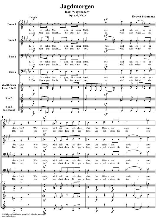 Digital Sheet Music for Jagdmorgen: "O frischer Morgen, frischer Mut", No. 3 from "Jagdlieder", Op. 137 by Robert Schumann scored for TTBB Choir and Four Horns; id:305012