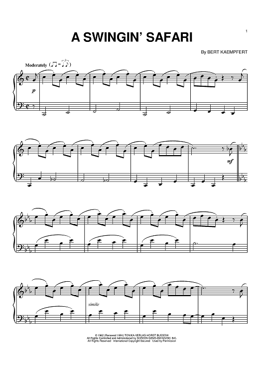 Digital Sheet Music for A Swingin' Safari by Bert Kaempfert, Billy Vaughn scored for Piano; id:396397