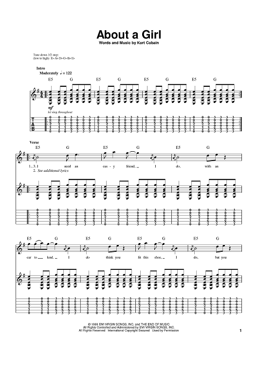Digital Sheet Music for About A Girl by Kurt Cobain, Nirvana scored for Guitar Tab; id:374287