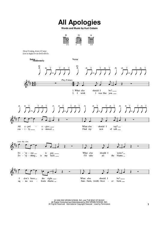 Digital Sheet Music for All Apologies by Kurt Cobain, Nirvana scored for Lead Sheet with Guitar Grids; id:372133