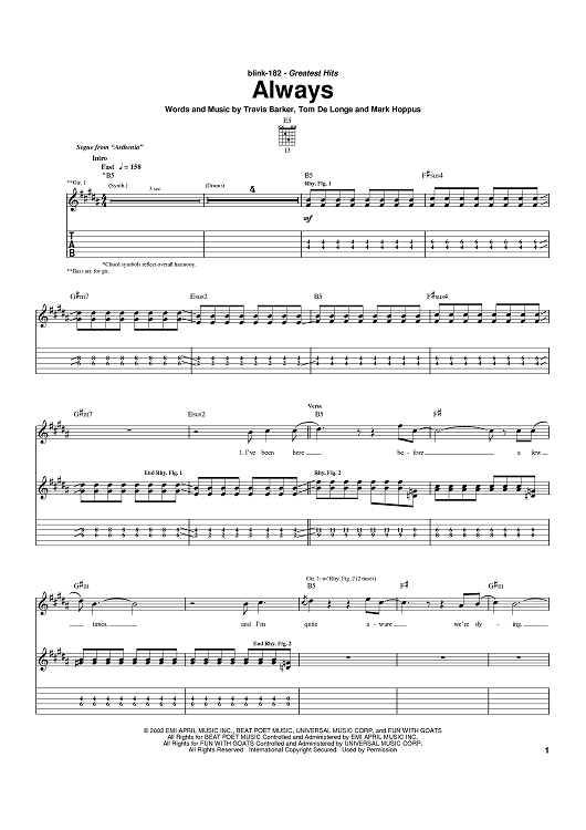 Digital Sheet Music for Always by Travis Barker, Mark Hoppus, blink-182, Tom DeLonge scored for Guitar Tab; id:373349