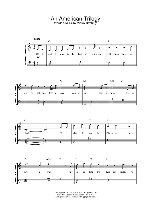 Digital Sheet Music for An American Trilogy by Elvis Presley, Mickey Newbury scored for Easy Piano; id:379045