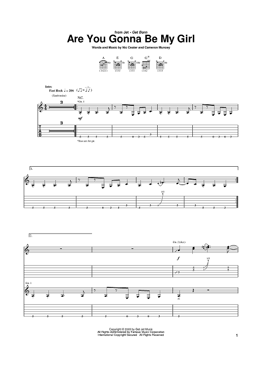 Digital Sheet Music for Are You Gonna Be My Girl by Nic Cester, Jet, Cam Muncey scored for Guitar Tab; id:374958