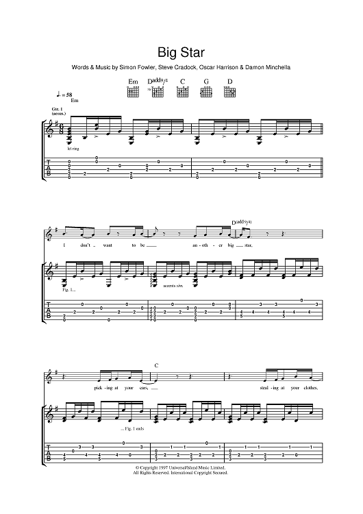 Digital Sheet Music for Big Star by Steve Cradock, Simon Fowler, Oscar Harrison, Damon Minchella, Ocean Colour Scene scored for Guitar Tab; id:393867