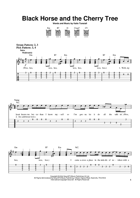 Digital Sheet Music for Black Horse And The Cherry Tree by Katie Tunstall, KT Tunstall scored for Easy Guitar Tab; id:396111