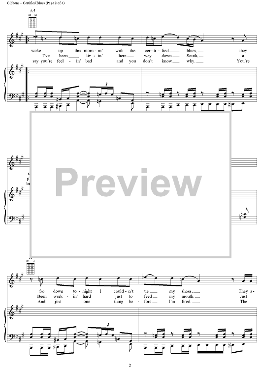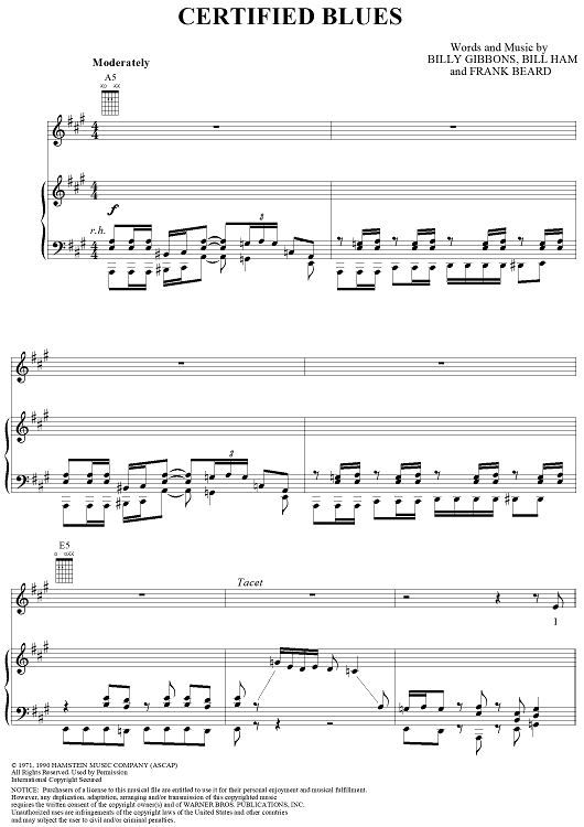Digital Sheet Music for Certified Blues by Billy Gibbons, Dusty Hill, Bill Ham, ZZ Top scored for Piano/Vocal/Chords; id:124310