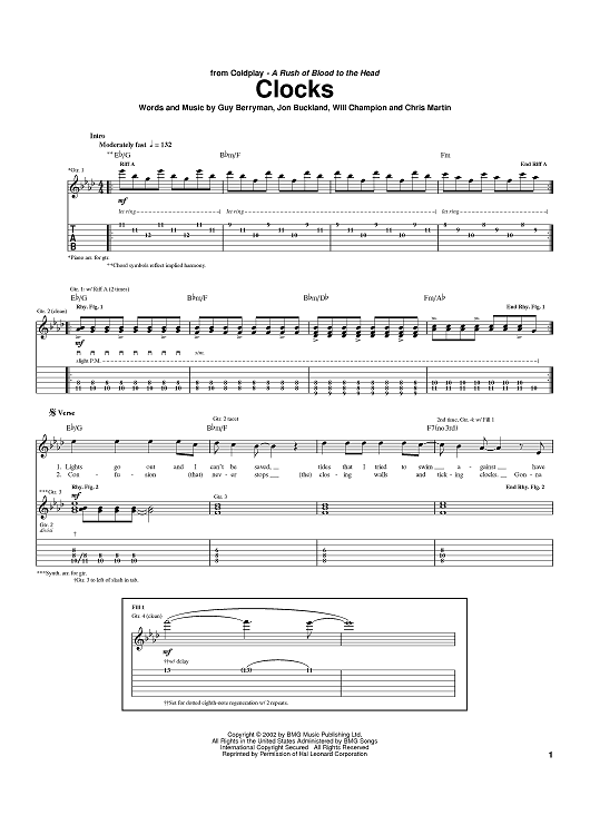 Digital Sheet Music for Clocks by Chris Martin, Coldplay, Jonny Buckland, Guy Berryman scored for Guitar Tab; id:392434