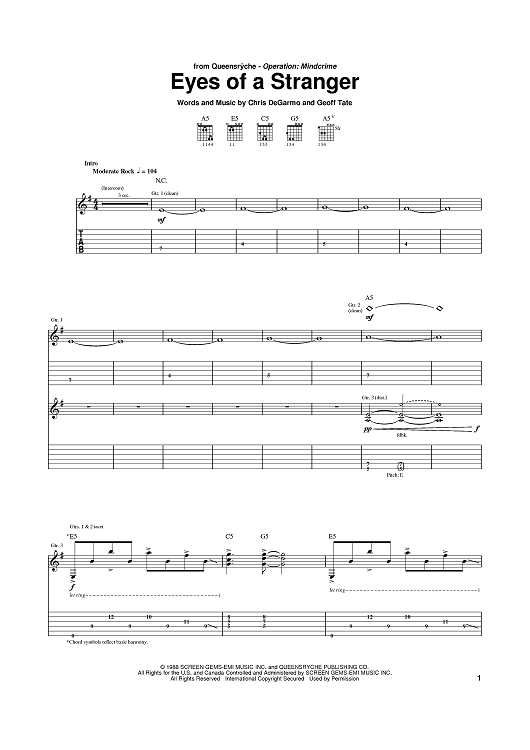 Digital Sheet Music for Eyes Of A Stranger by Chris DeGarmo, Queensrÿche, Geoff Tate scored for Guitar Tab; id:380493