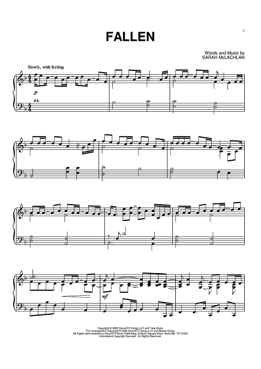 Digital Sheet Music for Fallen by Sarah McLachlan scored for Piano; id:390899