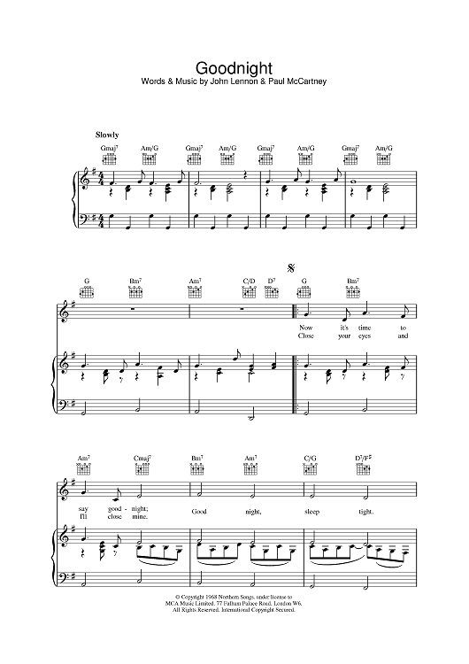 Digital Sheet Music for Goodnight by The Beatles, John Lennon scored for Piano/Vocal/Chords; id:382846