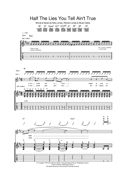 Digital Sheet Music for Half The Lies You Tell Ain't True by Stuart Cable, Kelly Jones, Richard Jones, Stereophonics scored for Guitar Tab; id:393499