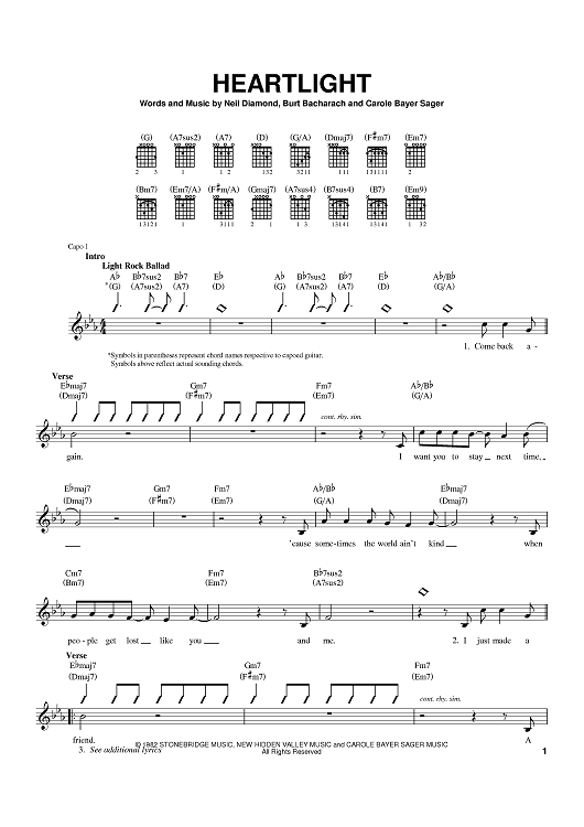 Digital Sheet Music for Heartlight by Carole Bayer Sager, Neil Diamond, Burt Bacharach scored for Lead Sheet with Guitar Grids; id:382191