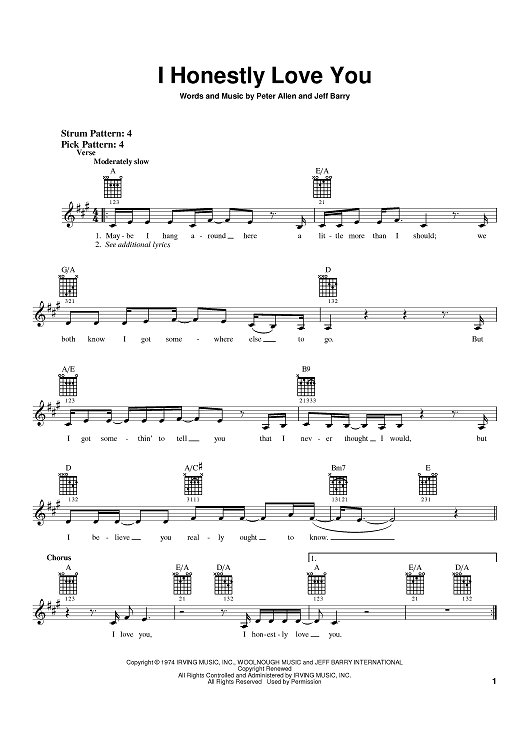 Digital Sheet Music for I Honestly Love You by Olivia Newton-John, Jeff Barry, Peter Allen scored for Lead Sheet with Guitar Grids; id:383092